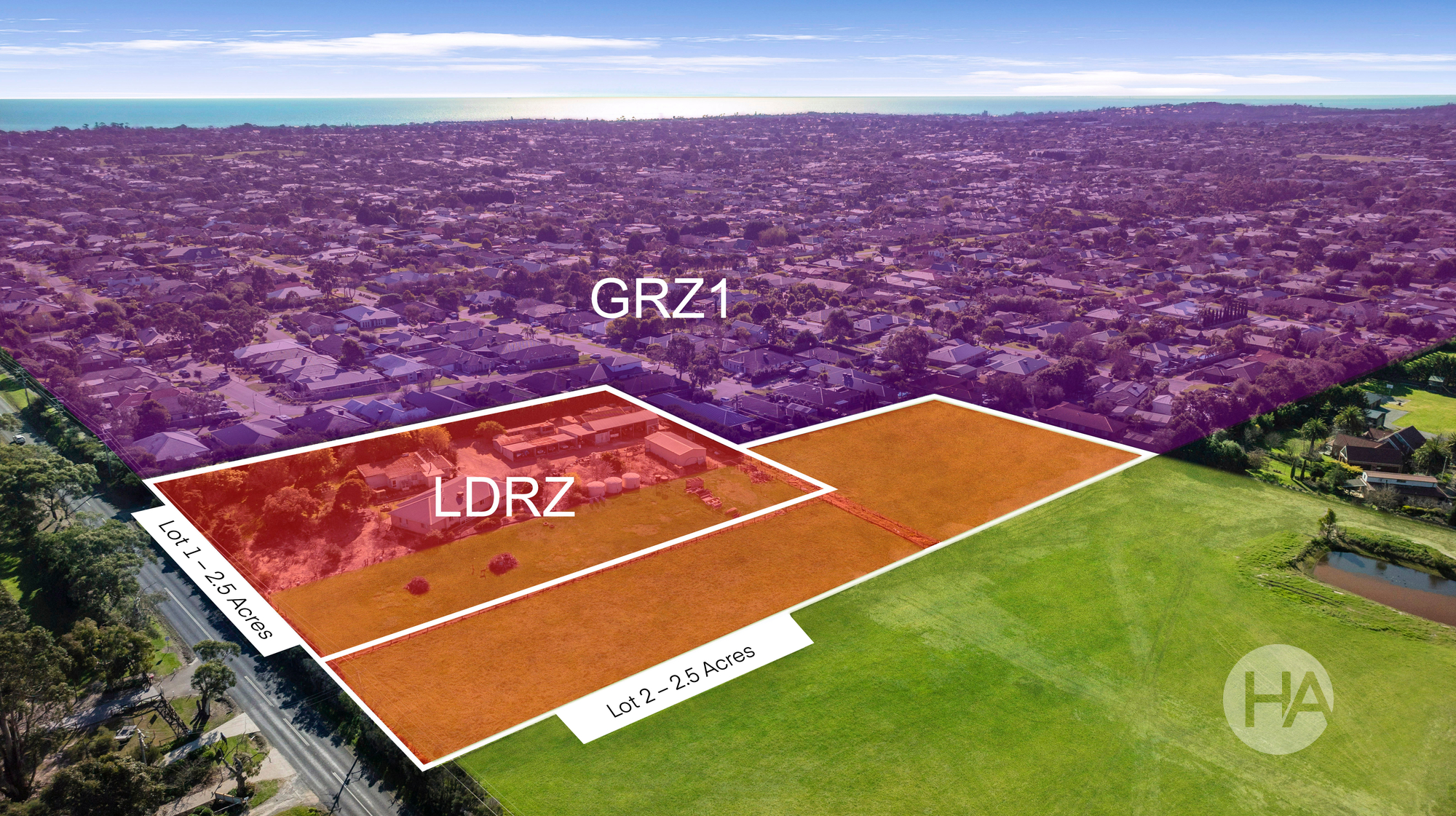 *Artist impressions of Lot 1 (2.5 Acres) and Lot 2 (2.5 Acres) are provided for illustrative purposes and are subject to council approval for subdivision.*