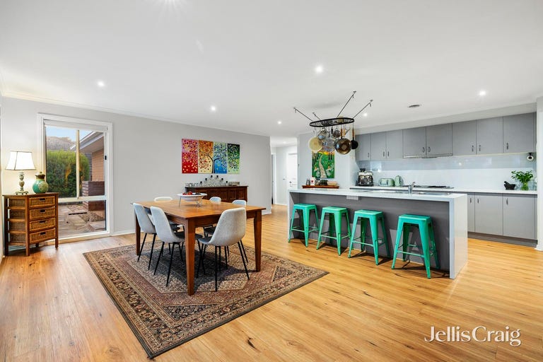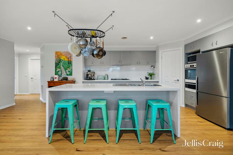 Oriented to capture poolside views, the central kitchen is appointed with stone surfaces, a waterfall-edge island, gas cooktop and corner pantry, flowing seamlessly between the main living zone and an open dining area. Framed by café blinds, pavers and a lemon tree, the alfresco offers a shaded retreat after a day in the magnesium pool and remains just as inviting when entertaining long into the night. Nearby, modular veggie boxes add a paddock-to-plate touch to a secure, low-maintenance yard that comfortably accommodates both pets and children.