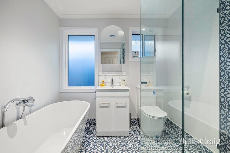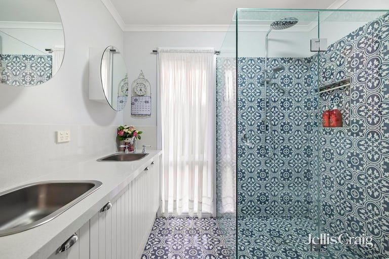 The main of three robed bedrooms enjoys a poolside position with direct access, a walk-in robe and ensuite, while the remaining bedrooms sit either side of a central bathroom with a freestanding bath, shower, and navy encaustic-look tiles that add tonal depth to its fresh palette. Hybrid flooring flows throughout, unifying the home’s single-level layout as generous glazing invites natural light and leafy outlooks into every space.