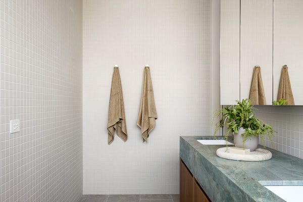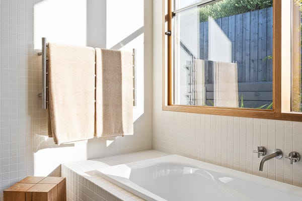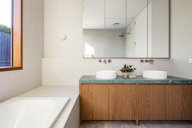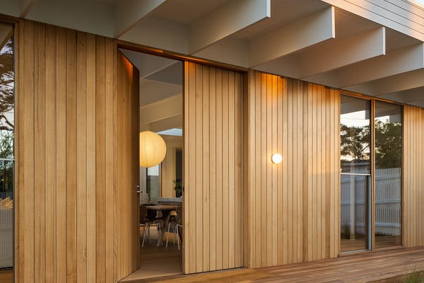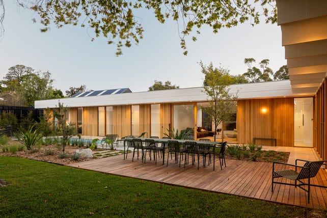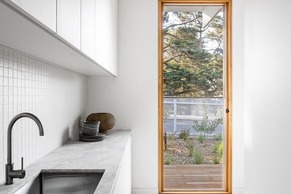 • Solid timber windows, brushed nickel tapware, and timber shiplap external cladding for timeless warmth and style