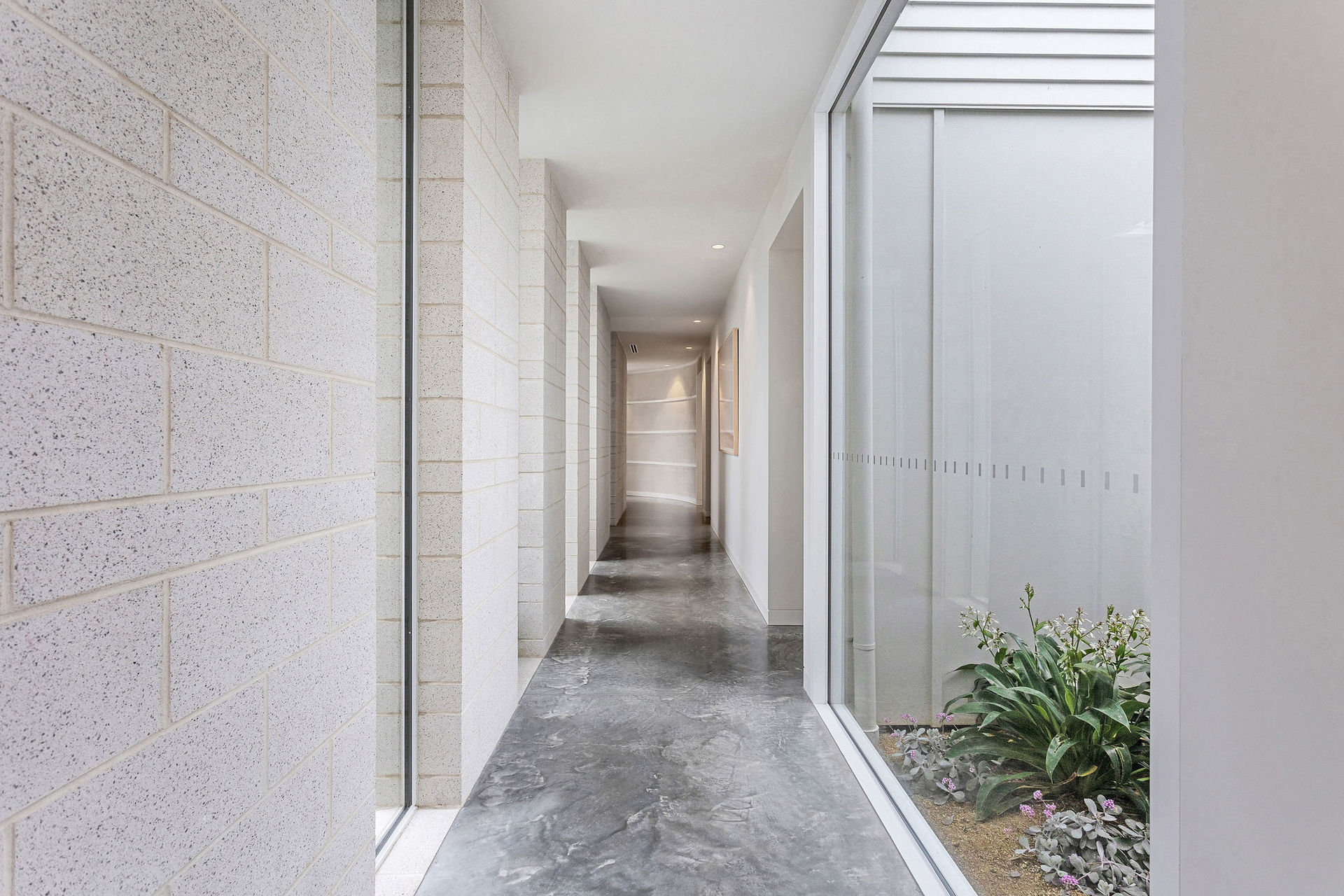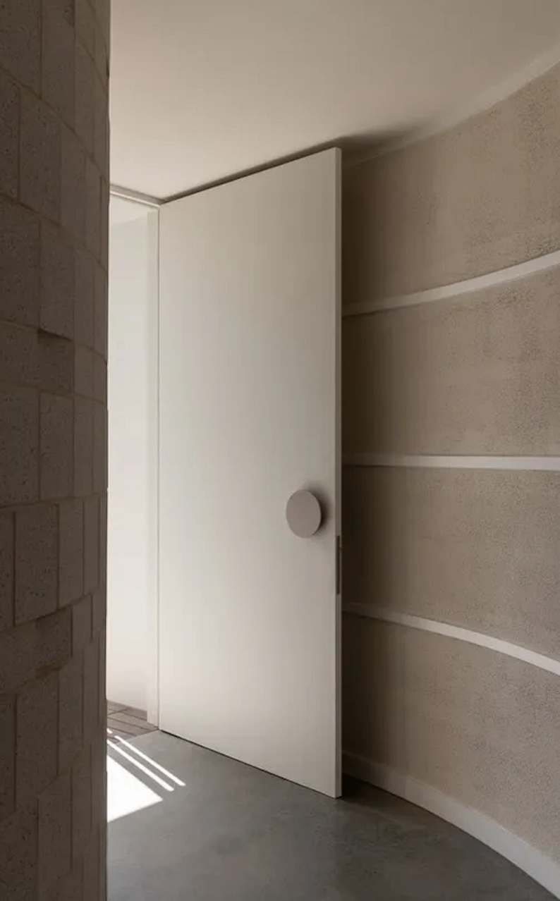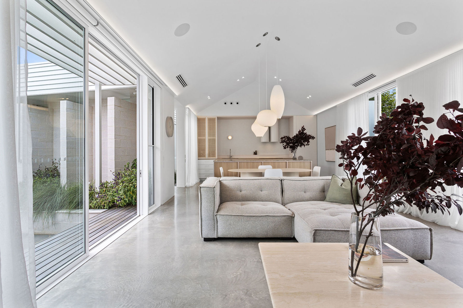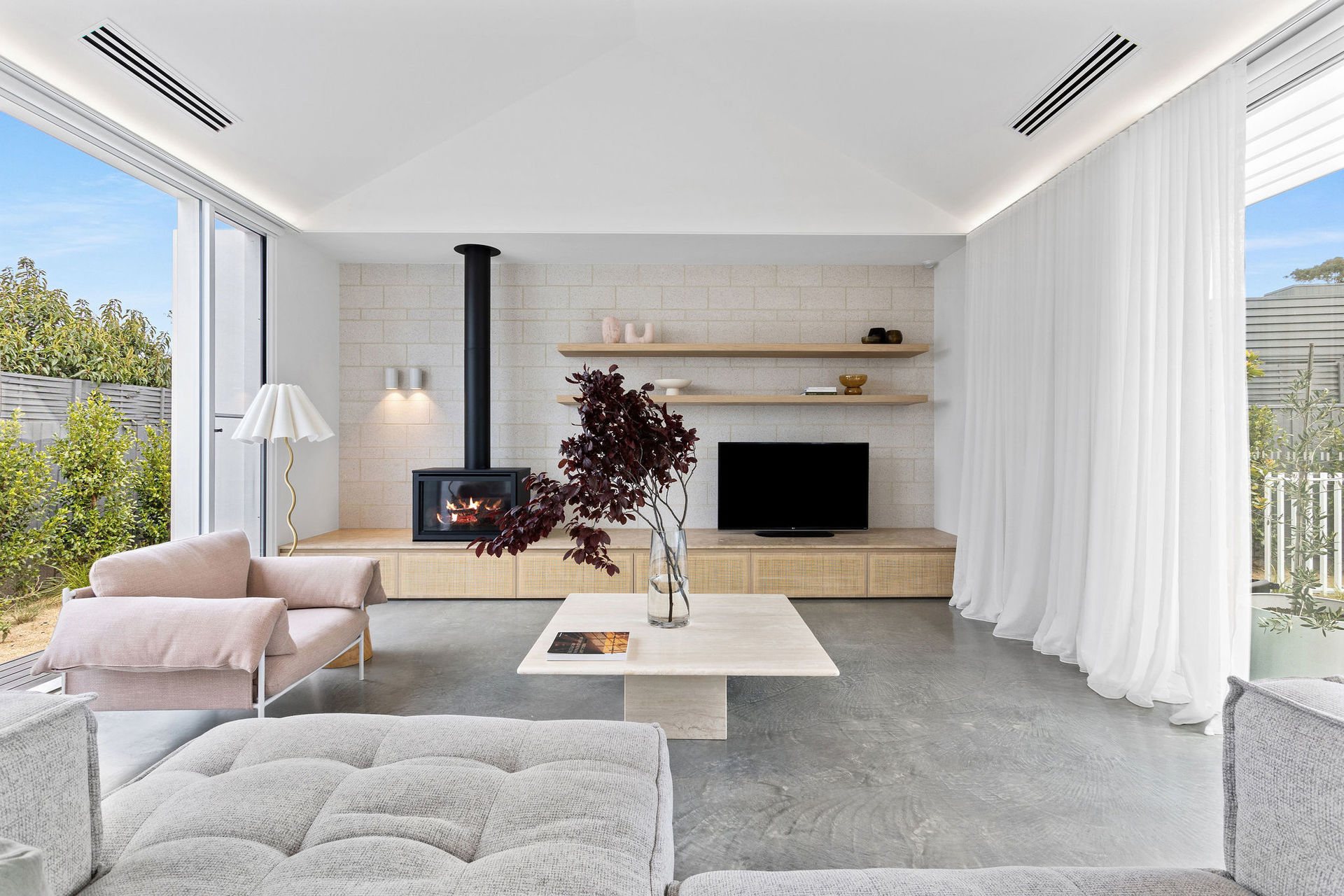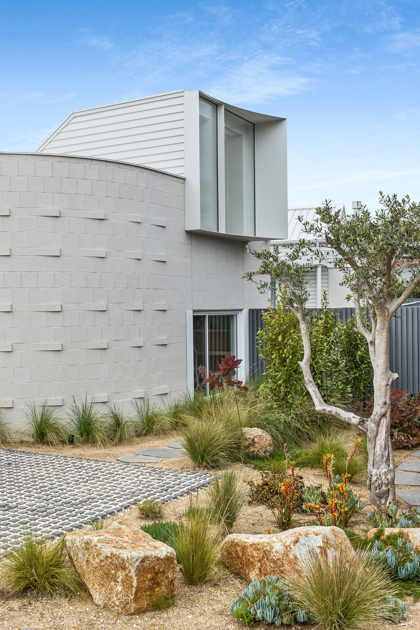 The exterior is a sculptural composition, where honed porcelain masonry blocks meet refined timber battens, all nestled within native gardens curated by Landscape Architect Bethany Williamson. The result is a visual symphony that harmonizes with the surrounding landscape. Inside, the home is a canvas of sophistication, with burnished concrete floors, gracefully curved walls, and expansive glazing that bathes the interiors in natural light.