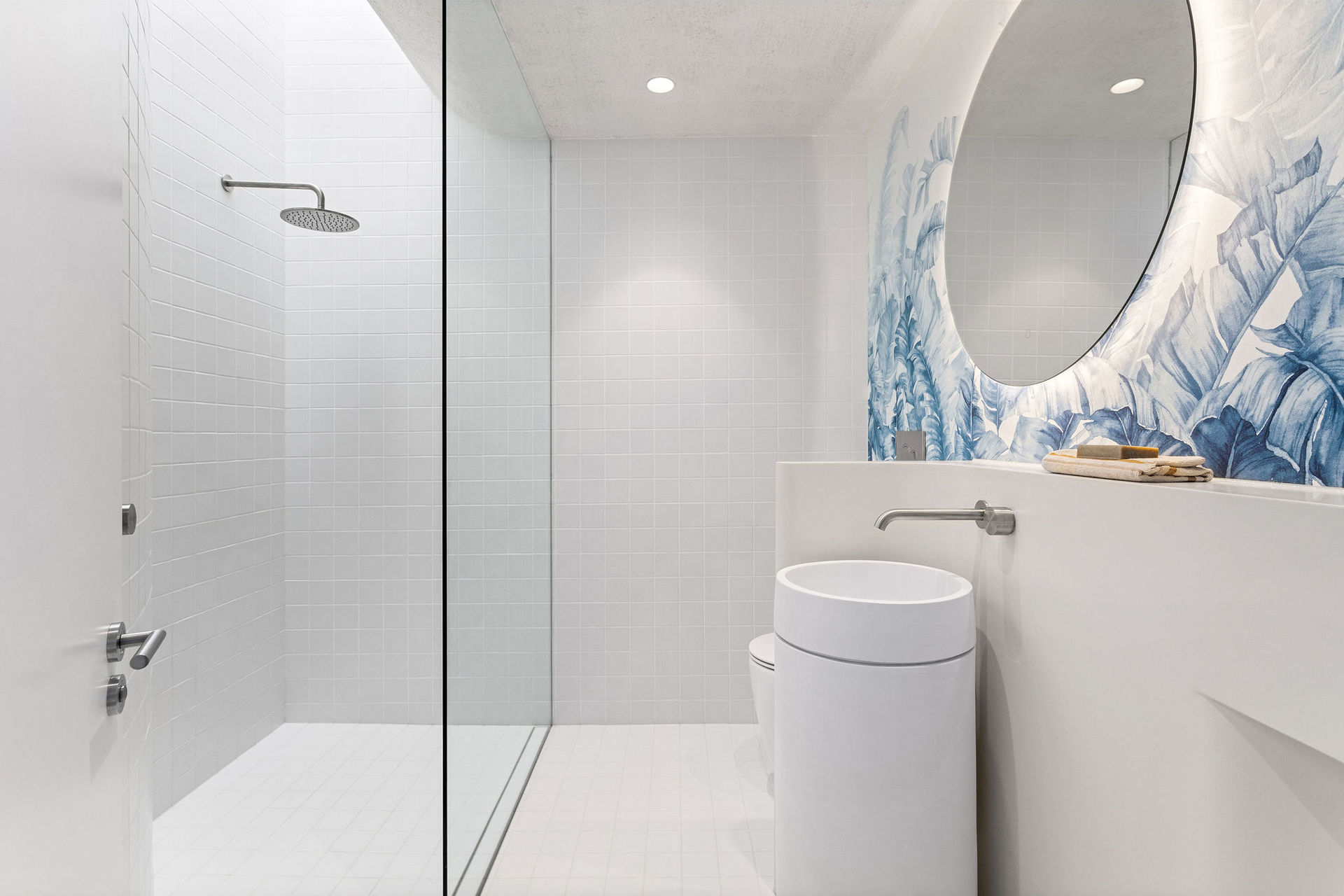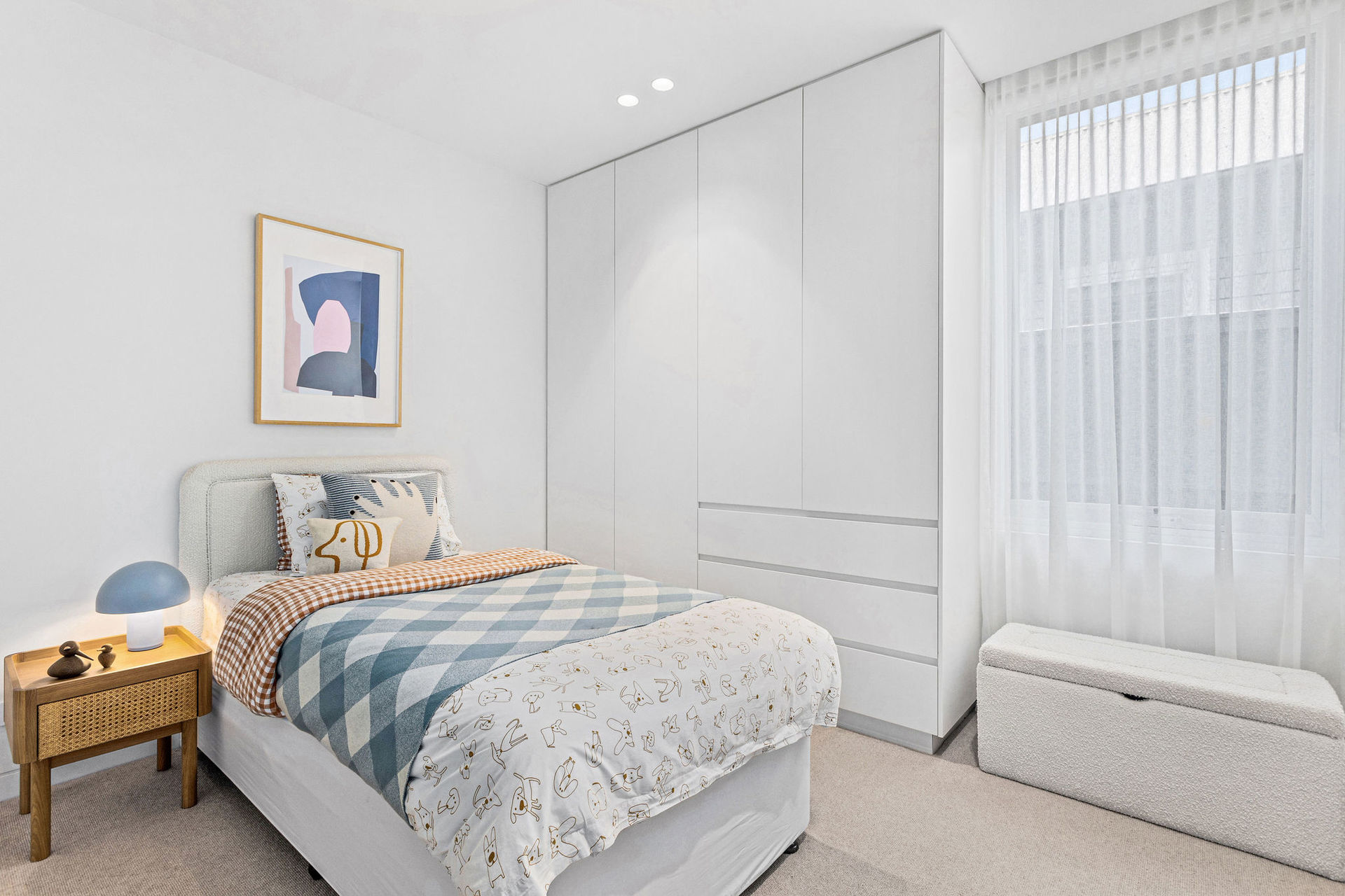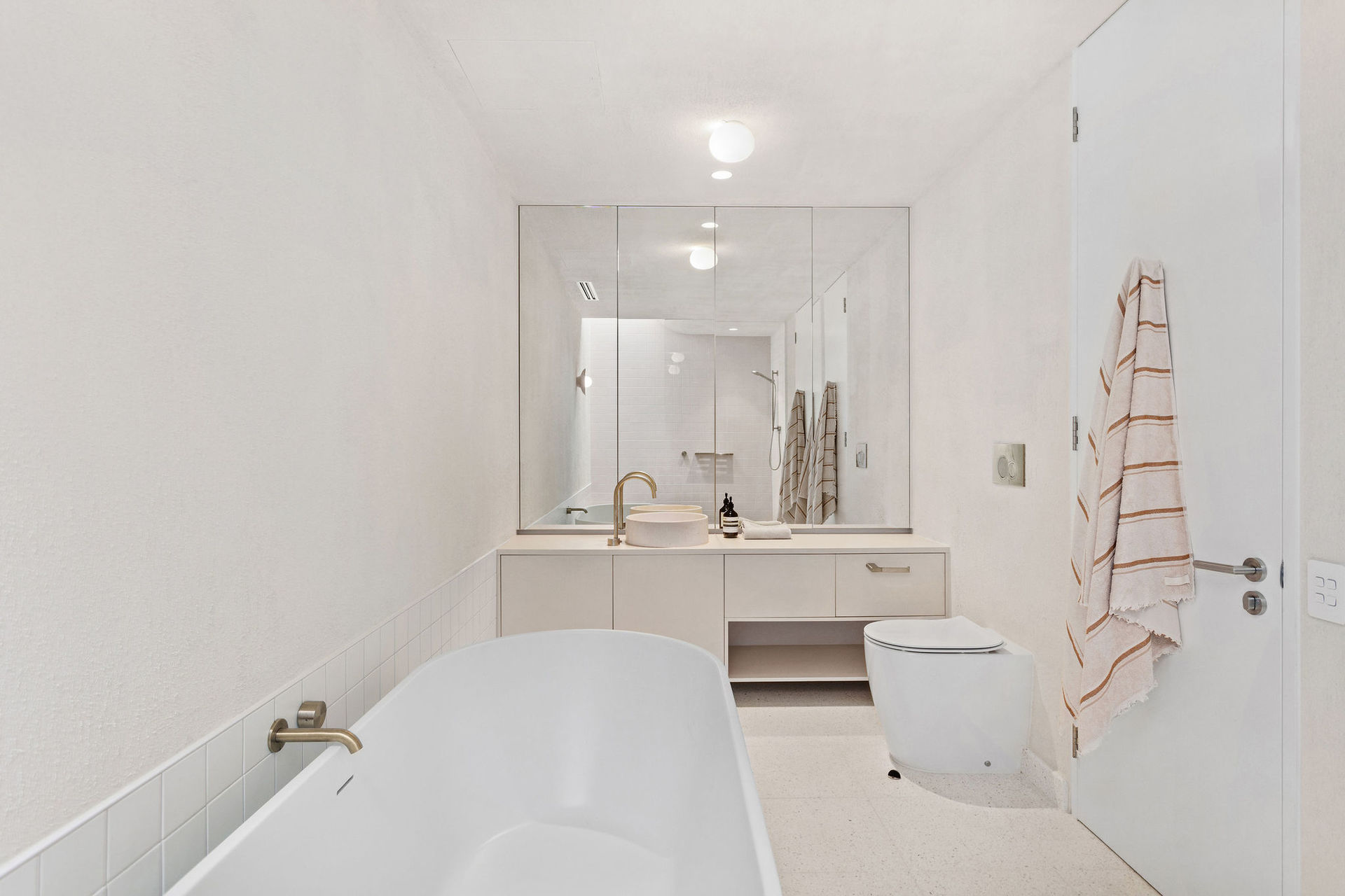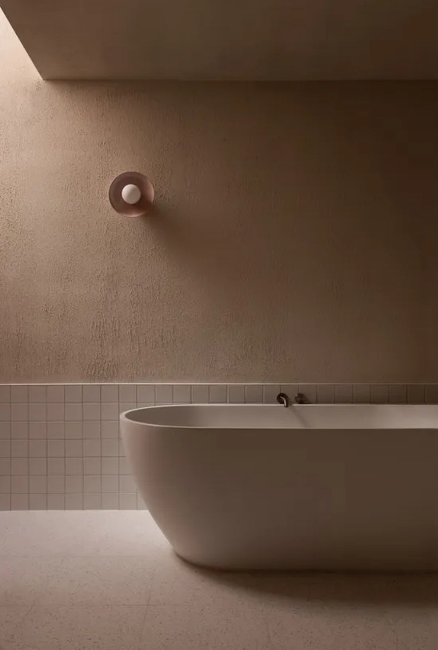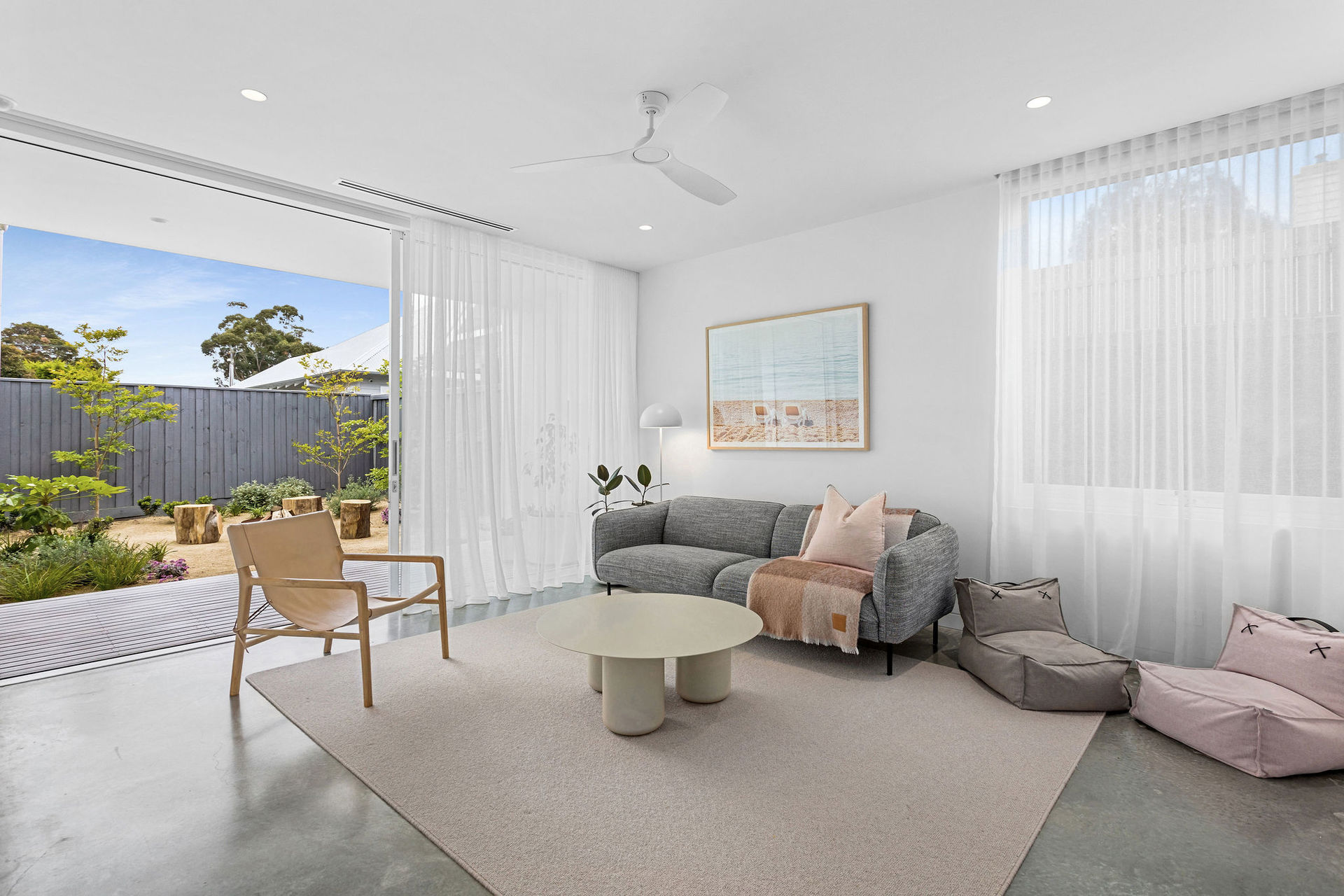 The exterior is a sculptural composition, where honed porcelain masonry blocks meet refined timber battens, all nestled within native gardens curated by Landscape Architect Bethany Williamson. The result is a visual symphony that harmonizes with the surrounding landscape. Inside, the home is a canvas of sophistication, with burnished concrete floors, gracefully curved walls, and expansive glazing that bathes the interiors in natural light.