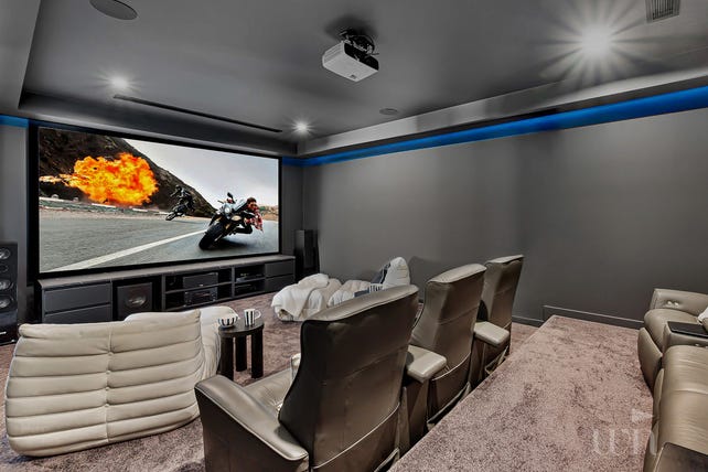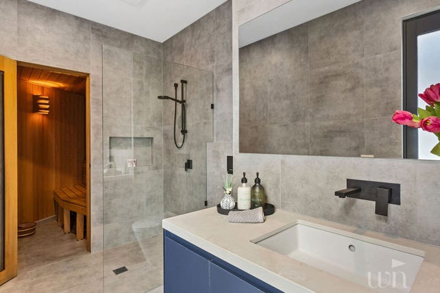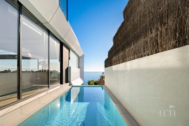 An open, free-flowing design merges effortlessly with the natural surrounds, drawing the outdoors in through expansive glazing and an abundance of natural light. Soaring ceilings, a calming palette, and layers of refined texture set the tone, while panoramic views across Port Phillip Bay create a mesmerising backdrop to everyday life. At the heart of the home, the main living space overlooks the custom-designed pool and spa, complete with a gas fireplace, built-in bar, and adjoining private cinema — creating a seamless blend of indulgence and comfort.