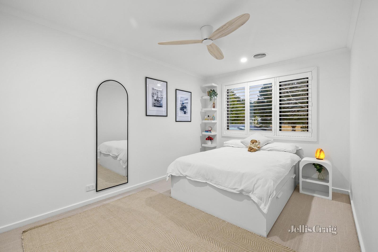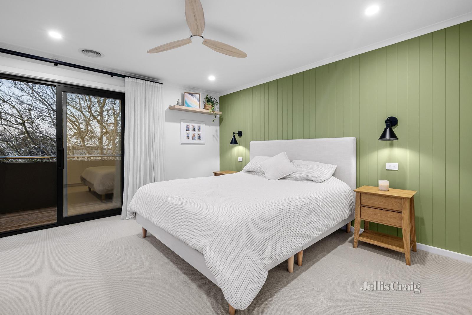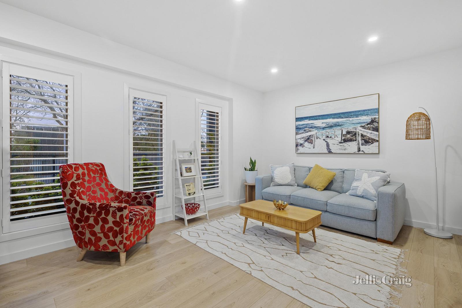 Upstairs accommodation spans three airy bedrooms, including the lavish master suite, which harnesses a coveted north-facing aspect that delights in views of Port Phillip Bay from the private balcony. Flowing sheers, bespoke cabinetry, and an ensuite with floor-to-ceiling tilling create a sense of serenity in this sanctuary, while a fourth bedroom on the lower level provides versatility as a second living area.