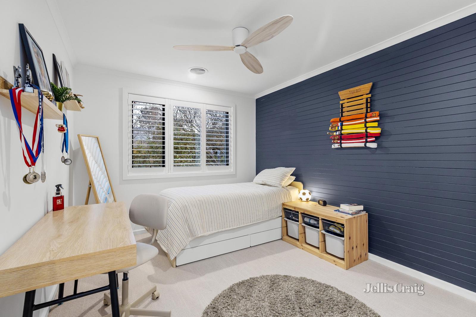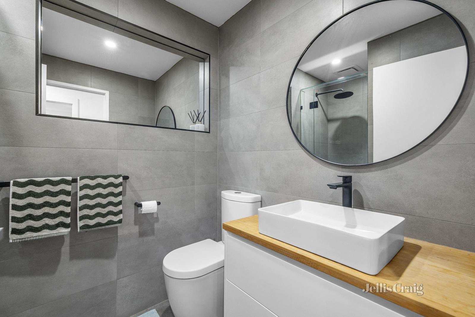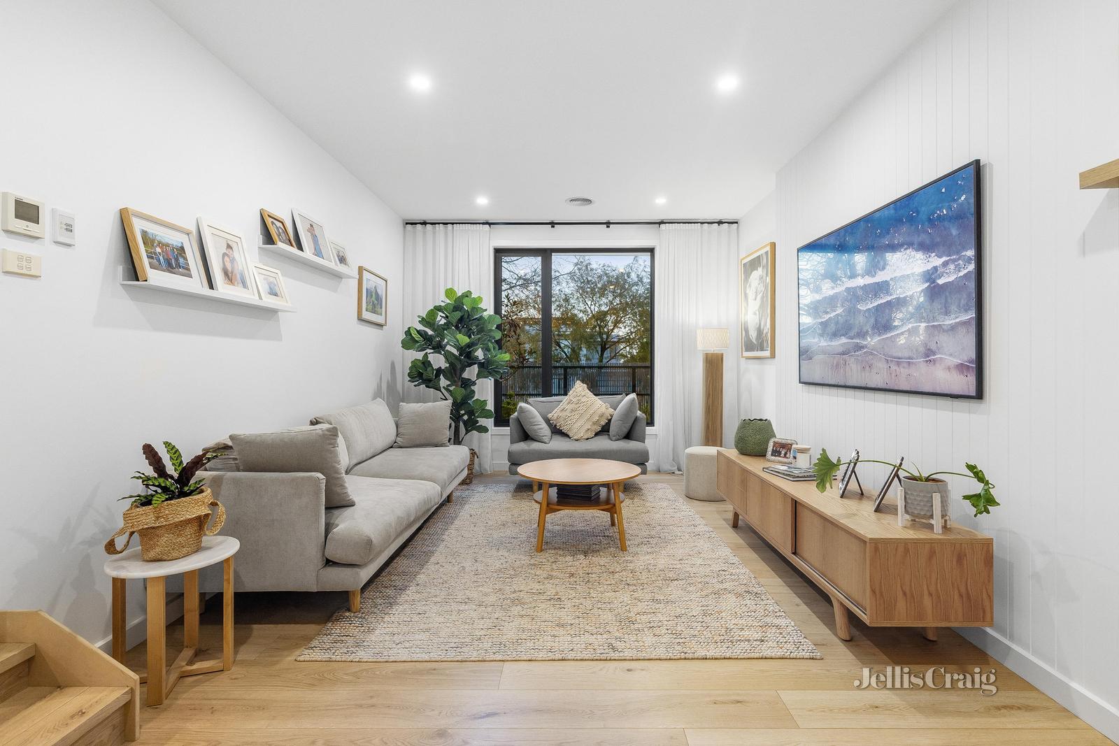 Upstairs accommodation spans three airy bedrooms, including the lavish master suite, which harnesses a coveted north-facing aspect that delights in views of Port Phillip Bay from the private balcony. Flowing sheers, bespoke cabinetry, and an ensuite with floor-to-ceiling tilling create a sense of serenity in this sanctuary, while a fourth bedroom on the lower level provides versatility as a second living area.