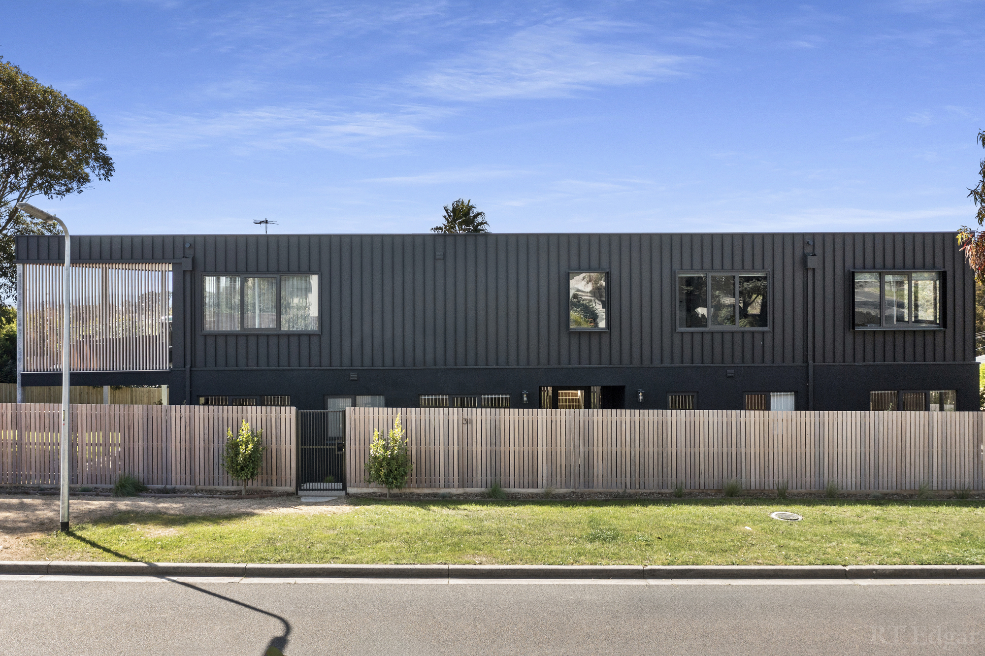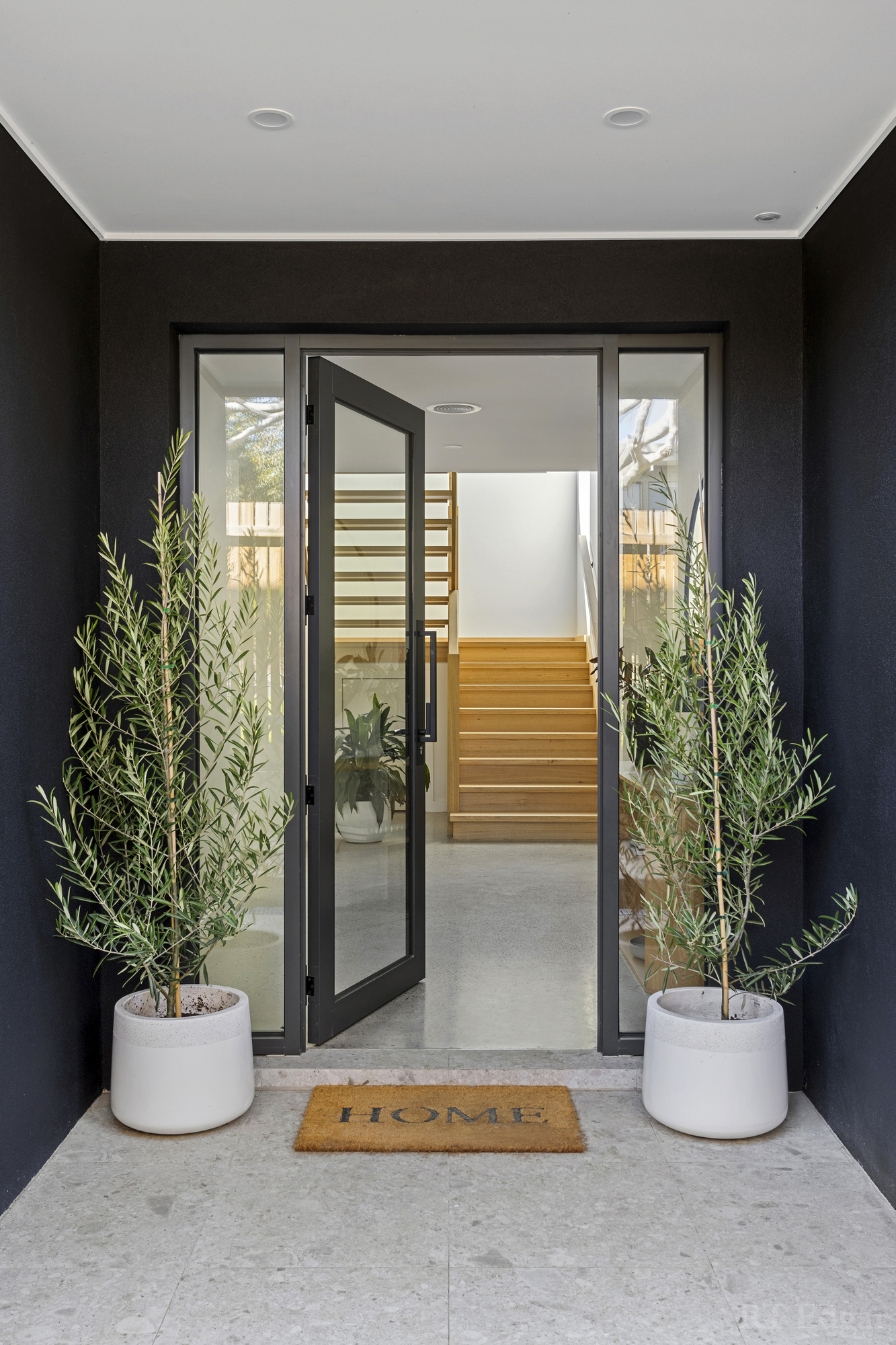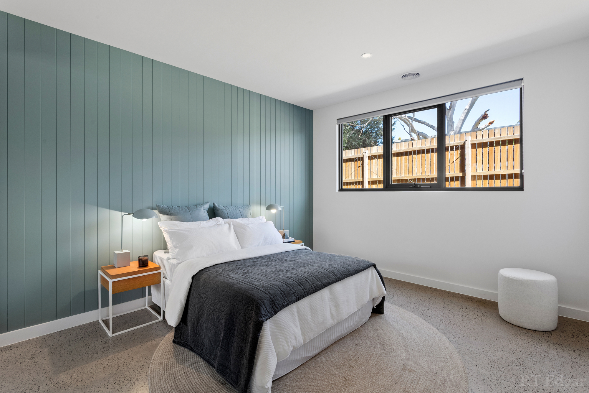 A seam-clad exterior contrasts elegantly with the whitewashed blackbutt fence, creating an immediate sense of seclusion. Upon entering through the grand glass door, you are welcomed by polished concrete floors and captivated by the lofty ceilings. The ground floor features a practical, yet charming mud room, along with a laundry area adorned in soothing blue tones and complete with a full wall of seamless, soft-touch cabinetry. This design mirrors the abundant integrated storage options available throughout the house. Further exploration reveals two large bedrooms, a lavish secondary master suite, a stylish main bathroom that showcases a scallop bathtub with a designer tile palette, and a generous family room with bifold doors that open to a professionally landscaped, peninsula native, drought-resistant garden.