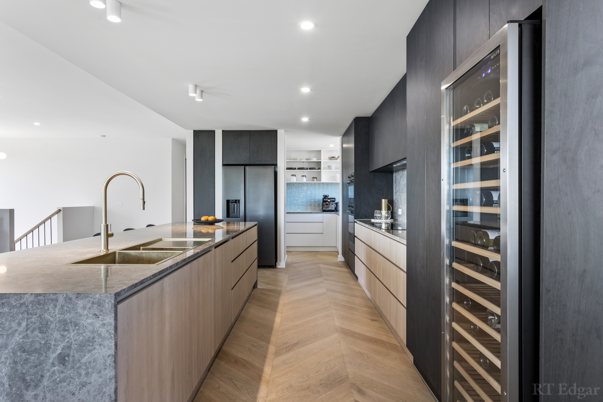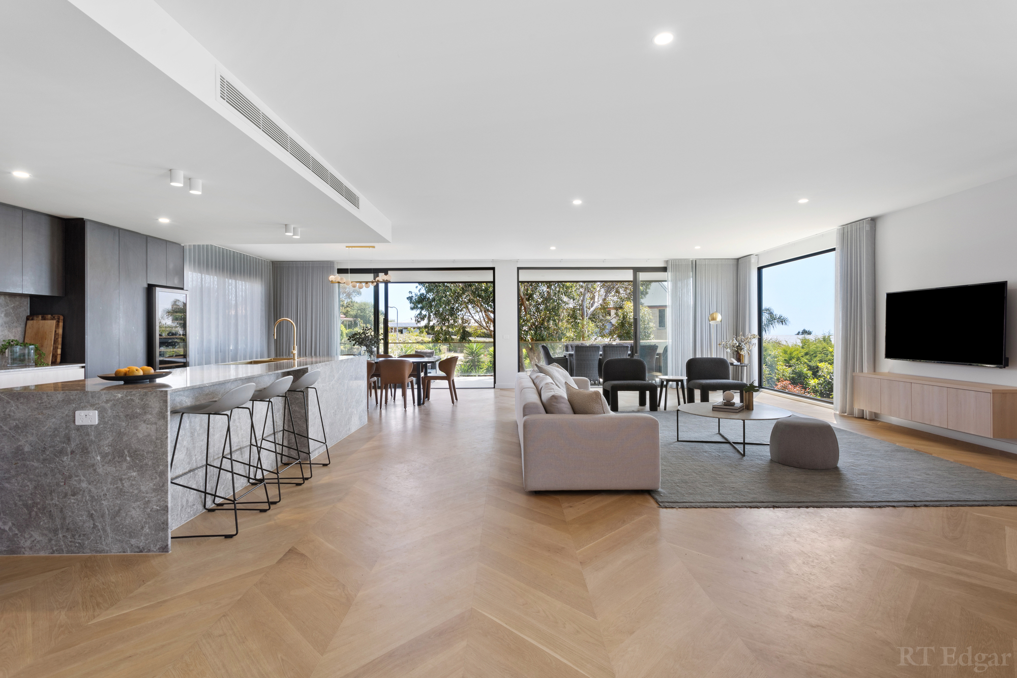 Ascending the wide hardwood floating timber staircase, your attention is drawn to the exquisite European Oak Chevron parquetry wood flooring and graceful pendant lights that await at the top. While these elements are undeniably impressive, the true focal point of this spacious home is the breathtaking panoramic views of Port Phillip Bay, Melbourne City skyline, and Mount Martha Golf Course. These awe-inspiring vistas are framed by expansive custom floor-to-ceiling windows, softly complemented by flowing linen sheers and can be savoured from every angle of the primary entertaining area. In the heart of this unconfined space, lies an open and inviting kitchen, equipped with high-end SMEG appliances, including a double oven, a wine fridge, a butler's pantry, and luxurious custom Tundra and Carrera stone countertops that elegantly complement the sleek cabinetry and stylish fixtures. This fluidly connects to the covered outdoor alfresco area for year-round pleasure.