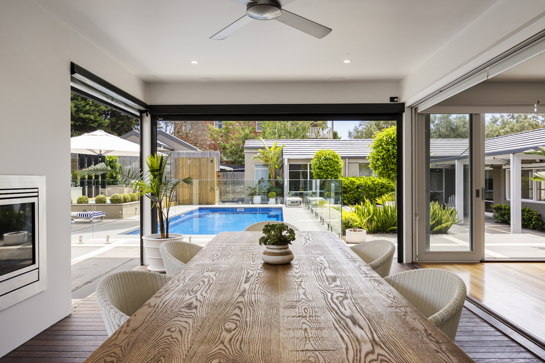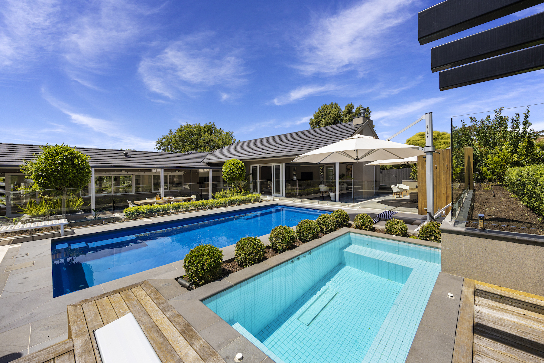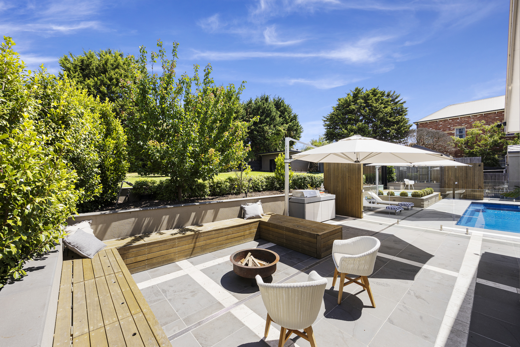 Embracing the unique design approach of landscaper Dave Franklin, the outdoor setting is a masterclass in landscape architecture. The expansive garden and pool area have been meticulously planned for year-round enjoyment, where an in-ground heated pool is coupled with an upper-level spa - providing an idyllic spot for relaxation. It offers elevated lawns, an open-air patio for summer entertaining, and a brilliant indoor-outdoor alfresco that takes hosting to an entirely new level, equipped with a kitchenette, drinks fridges, a gas fireplace and remote blinds that seamlessly integrate with the outdoors.