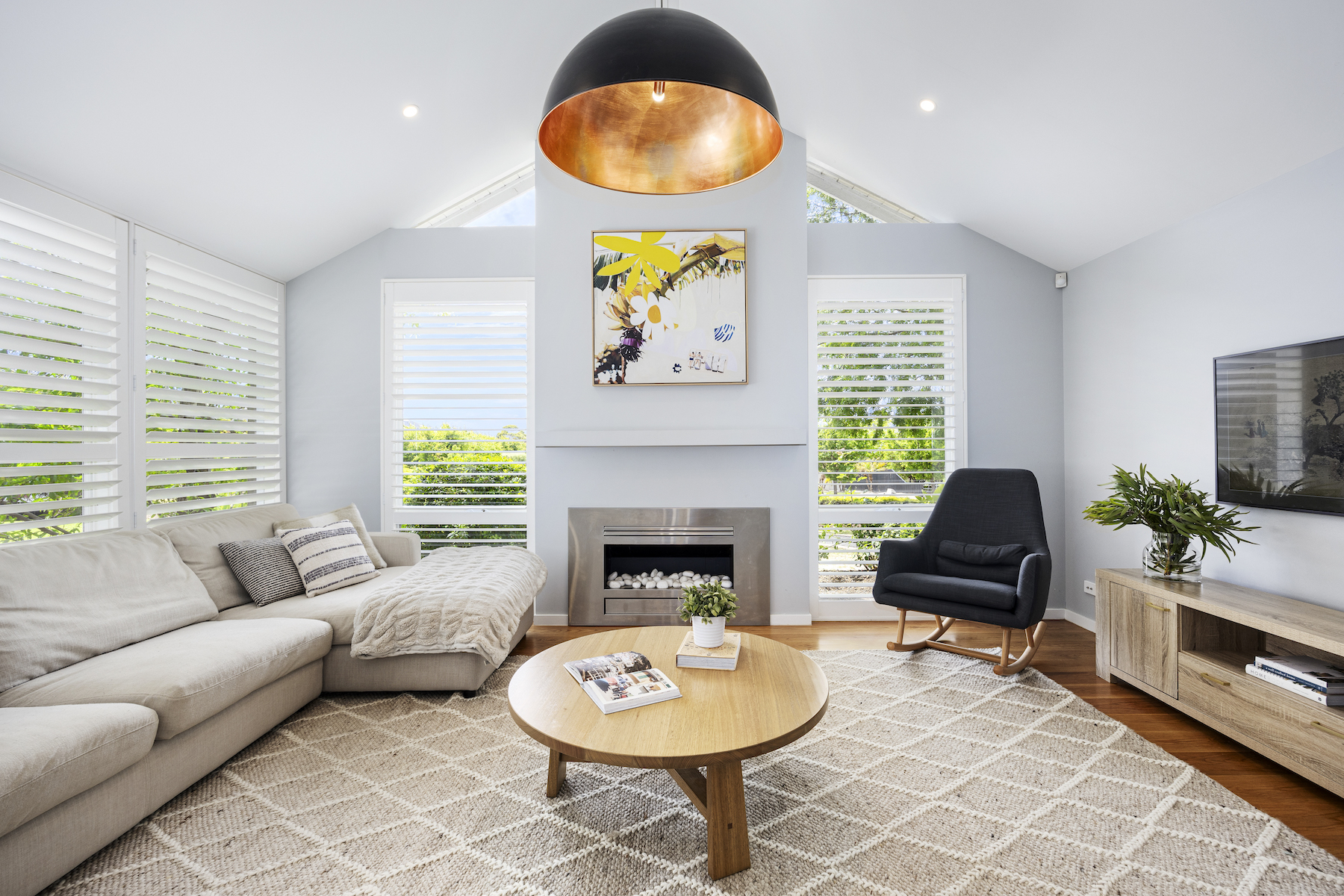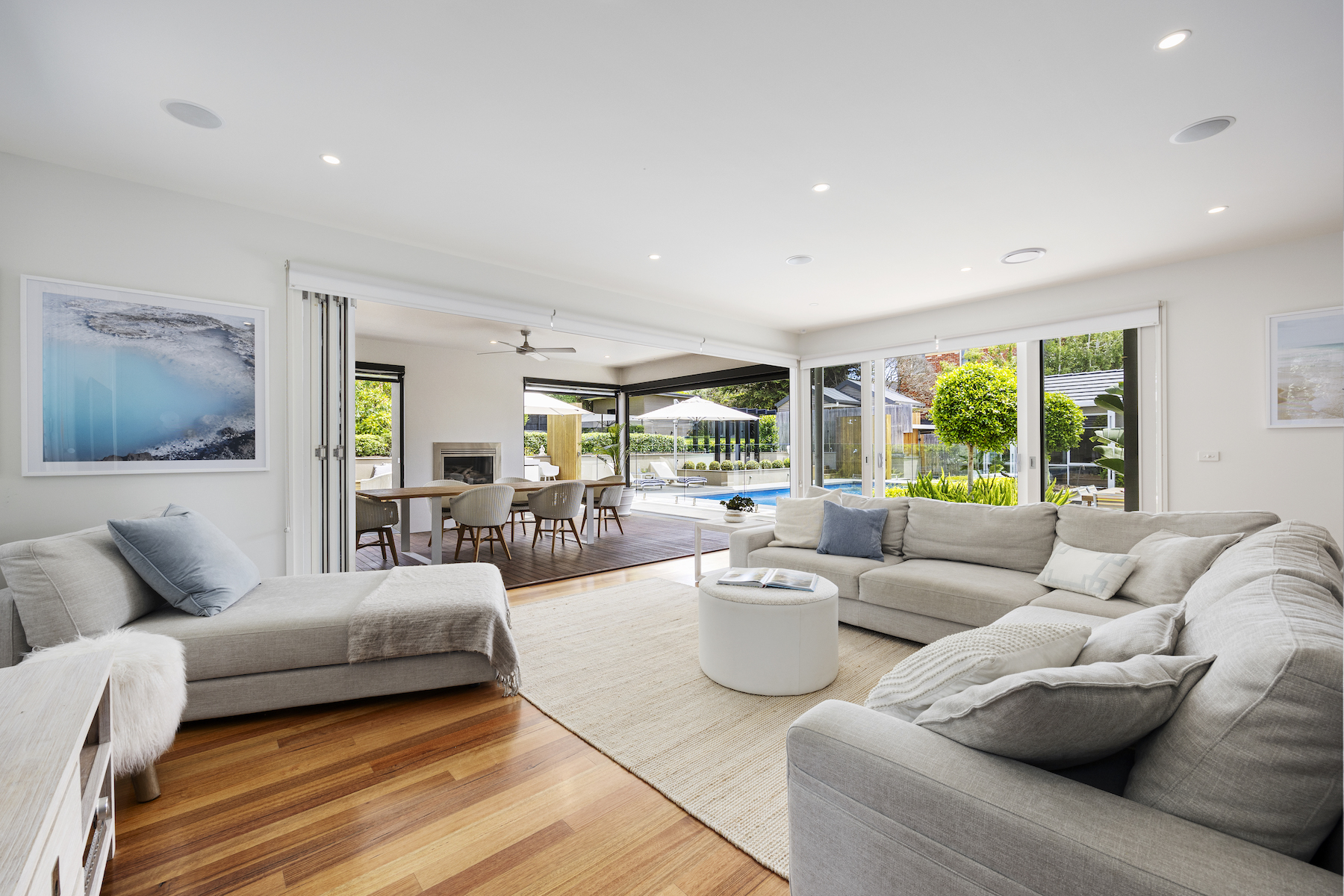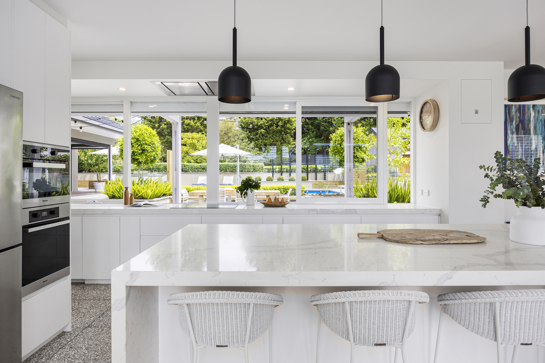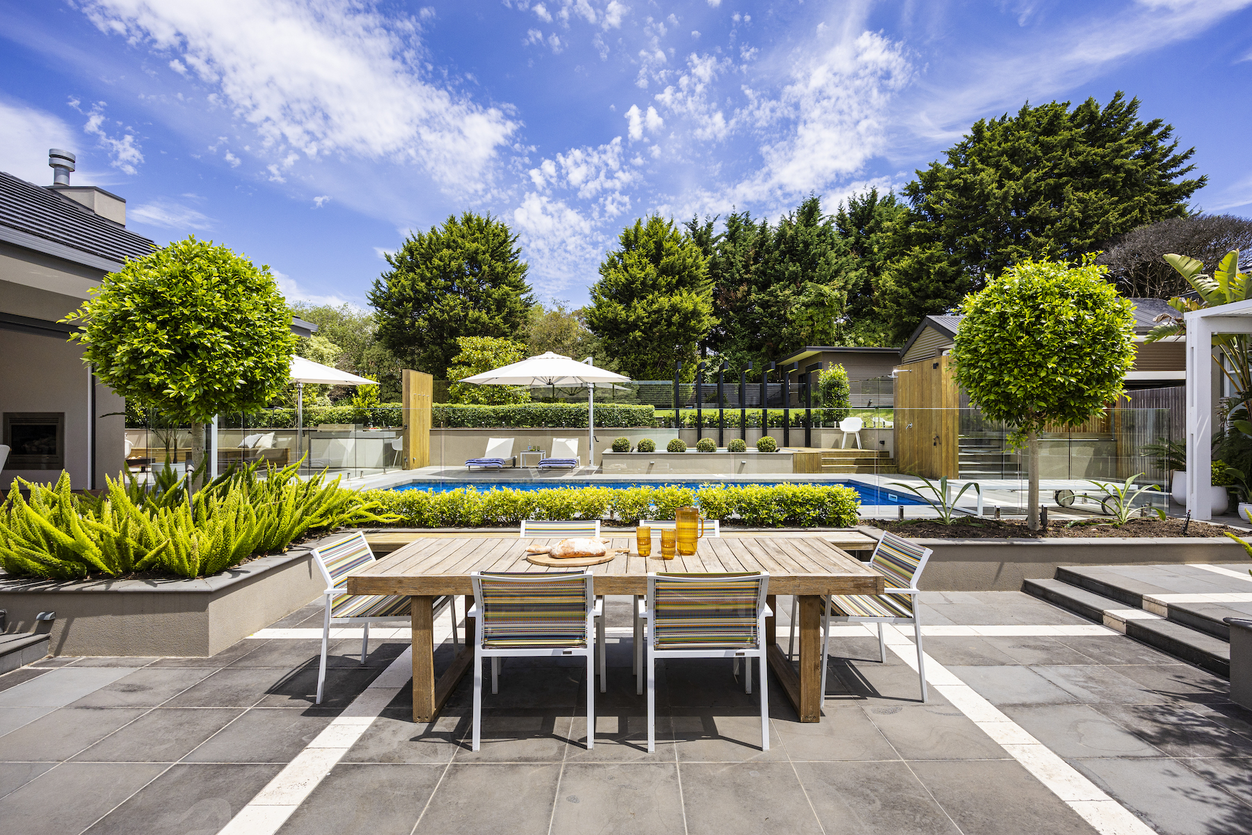 Embracing the unique design approach of landscaper Dave Franklin, the outdoor setting is a masterclass in landscape architecture. The expansive garden and pool area have been meticulously planned for year-round enjoyment, where an in-ground heated pool is coupled with an upper-level spa - providing an idyllic spot for relaxation. It offers elevated lawns, an open-air patio for summer entertaining, and a brilliant indoor-outdoor alfresco that takes hosting to an entirely new level, equipped with a kitchenette, drinks fridges, a gas fireplace and remote blinds that seamlessly integrate with the outdoors.