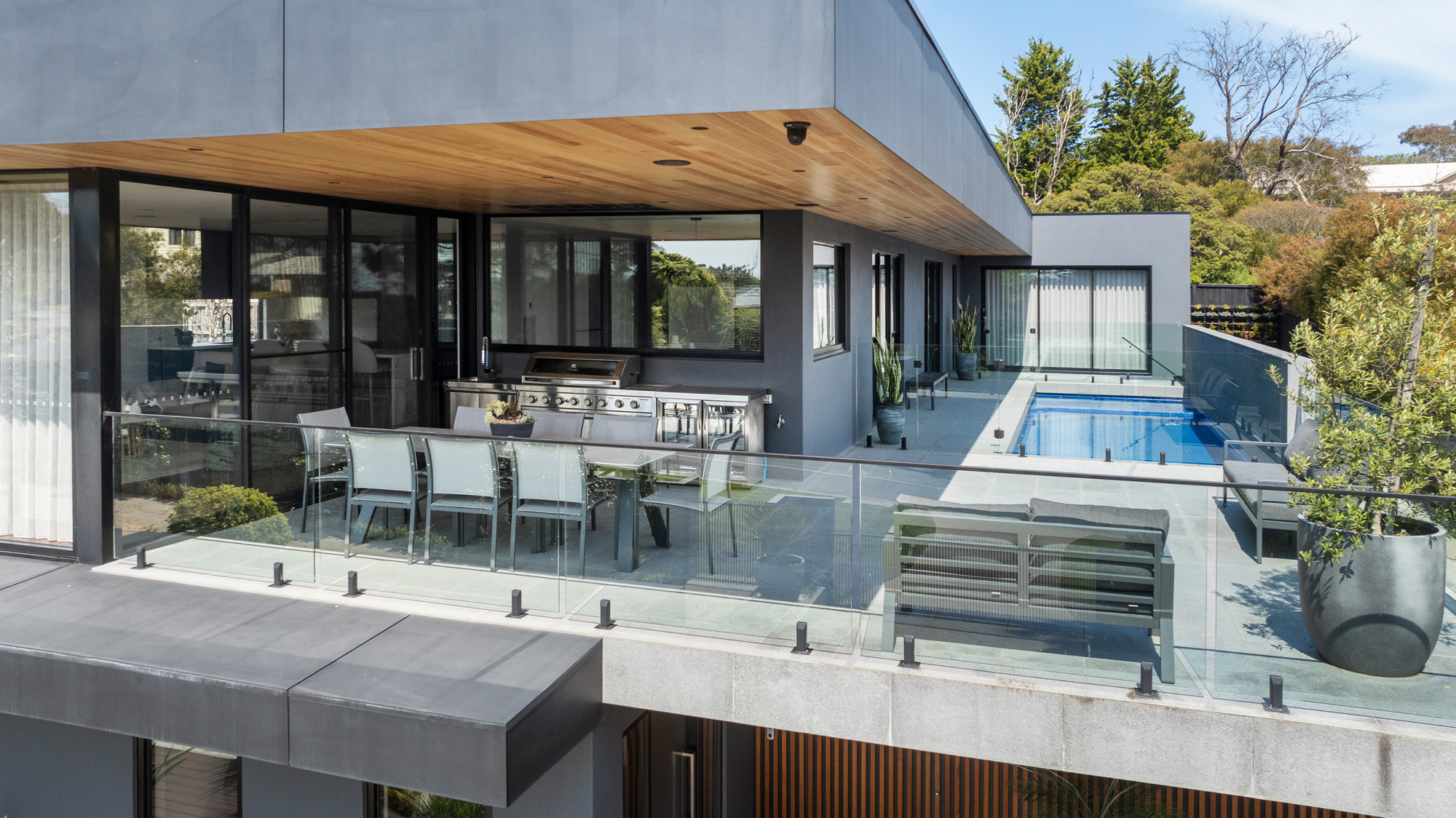 The kitchen is a culinary masterpiece, equipped with integrated appliances and a spacious butler's pantry to meet all your needs. Enjoy the beachside atmosphere as cool bay breezes flow through oversized glass sliding doors. Step outside to a generous entertaining deck complete with a built-in kitchen, and indulge in the unique first-level heated pool and spa. The master suite serves as a private sanctuary, featuring a custom walk-in robe and an ensuite with a freestanding stone bath. Upstairs, two additional bedrooms each have walk-in robes and private ensuites.