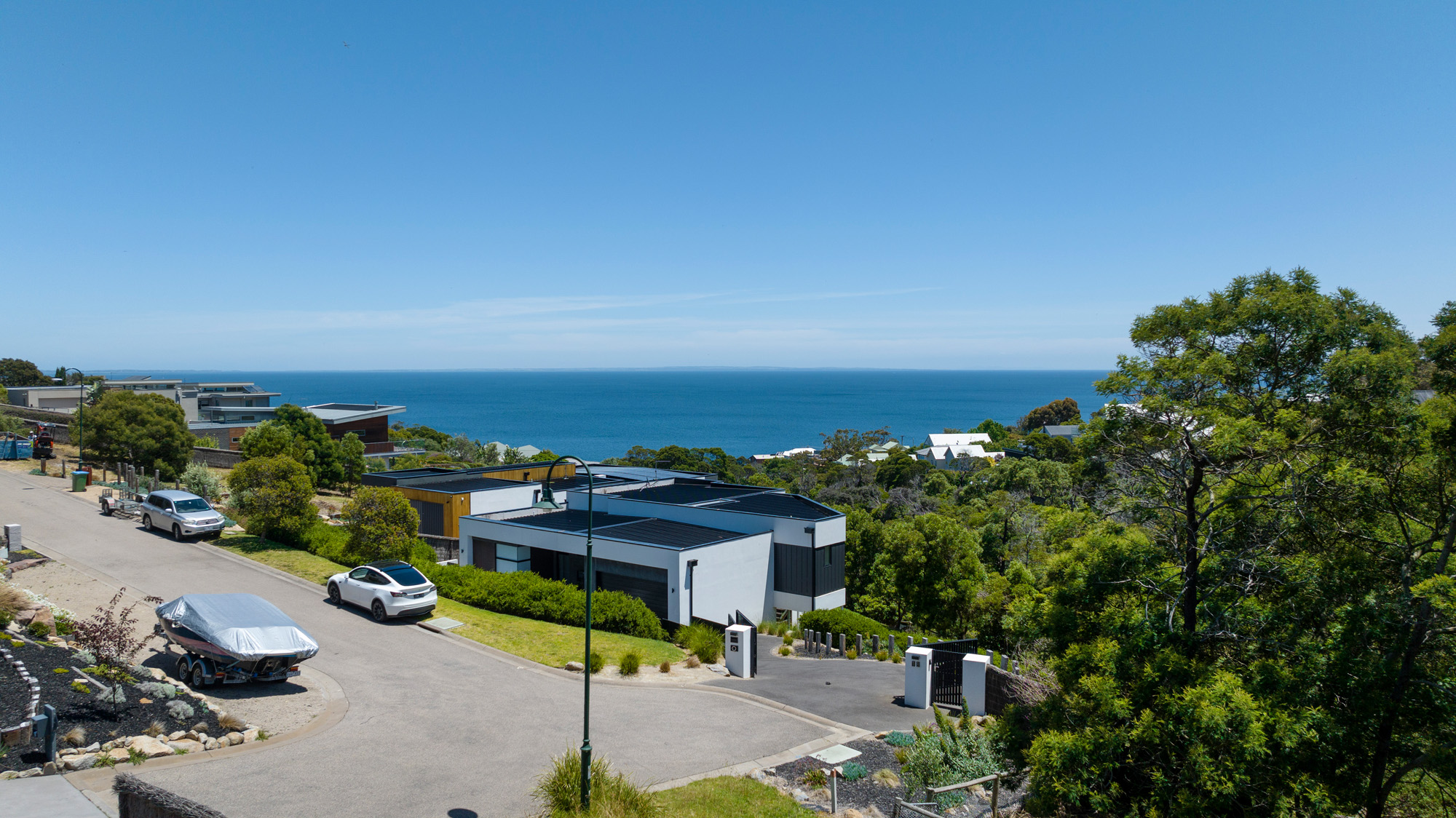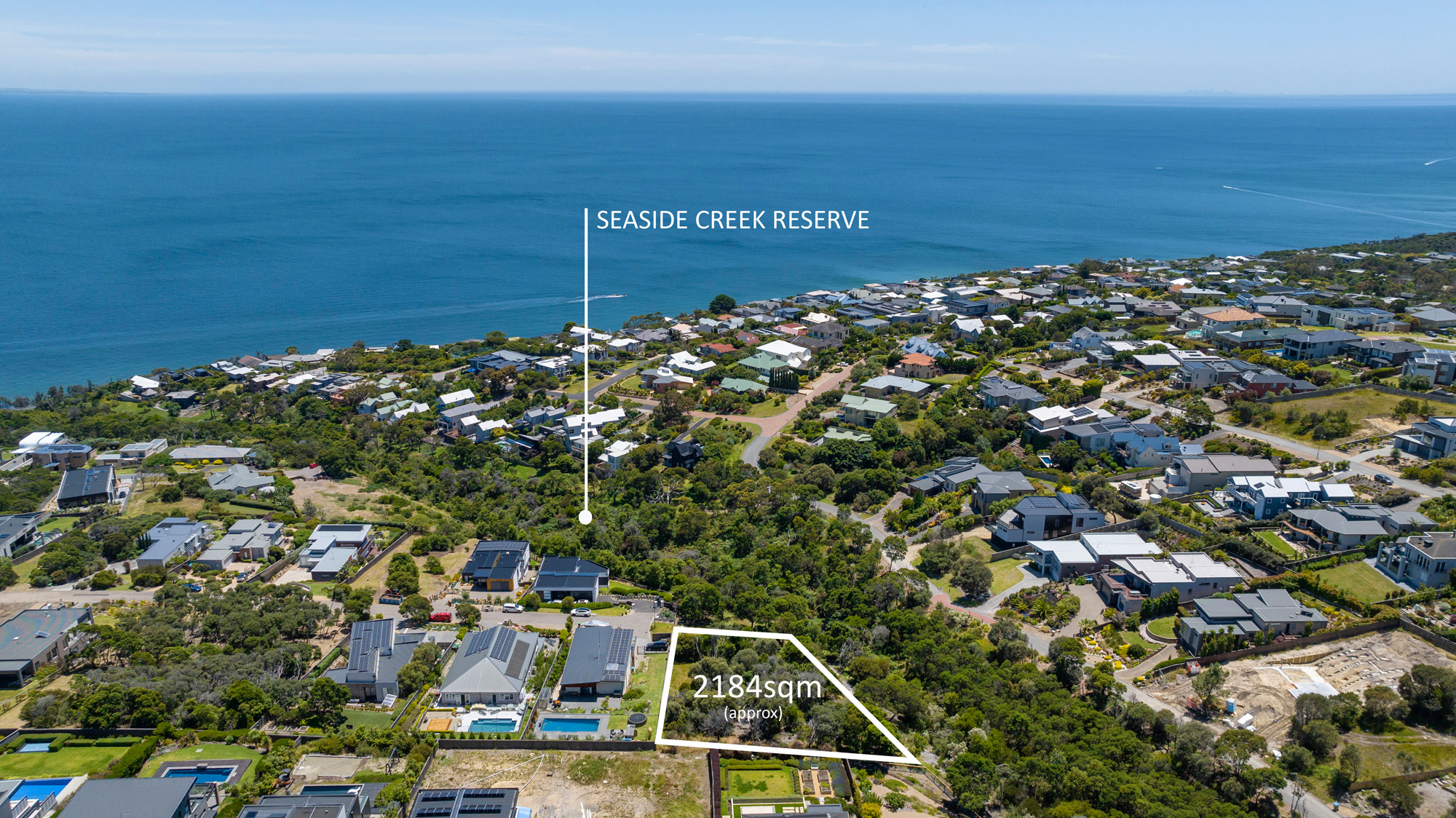 VERDE MAR Capturing jaw-dropping panoramic views across Port Phillip Bay that can never be built out, this elevated half-acre allotment spilling onto tranquil neighbouring bushland offers the most spectacular site to construct your dream coastal home (STCA). Situated on a tightly-held cul-de-sac peppered with incredible architectural abodes, the property is protected by an overlay securing the breathtaking outlook across the blue horizon. A two-storey home could harness expansive bay vistas across the bay to the Bellarine Peninsula, You Yangs and Melbourne city skyline, while the close proximity to the village, stunning beaches, crystal coves, golf courses and the marina provides a lifestyle-lover’s playground. Cradled at the end of the court on the high side of the street, the cascading block rolls down to Seaside Creek and offers ample room for a large luxury home backdropped by native birdsong, bobbing yachts and eternal sunsets.