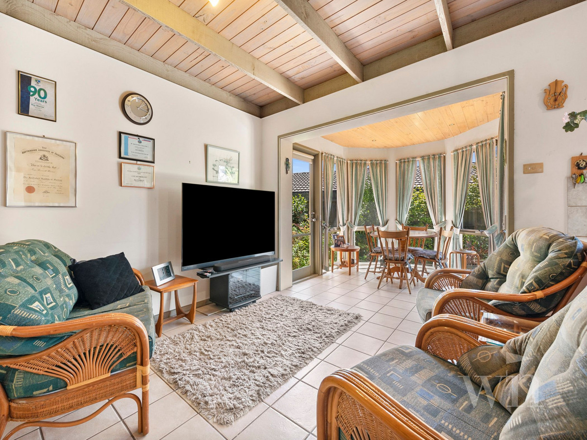 Combining neutral tones with timber rafters and skylights invites a cosy sense of feeling home. A spacious living area leads to a formal dining adjoining the functional country-style kitchen with second living and a beautiful sunroom.